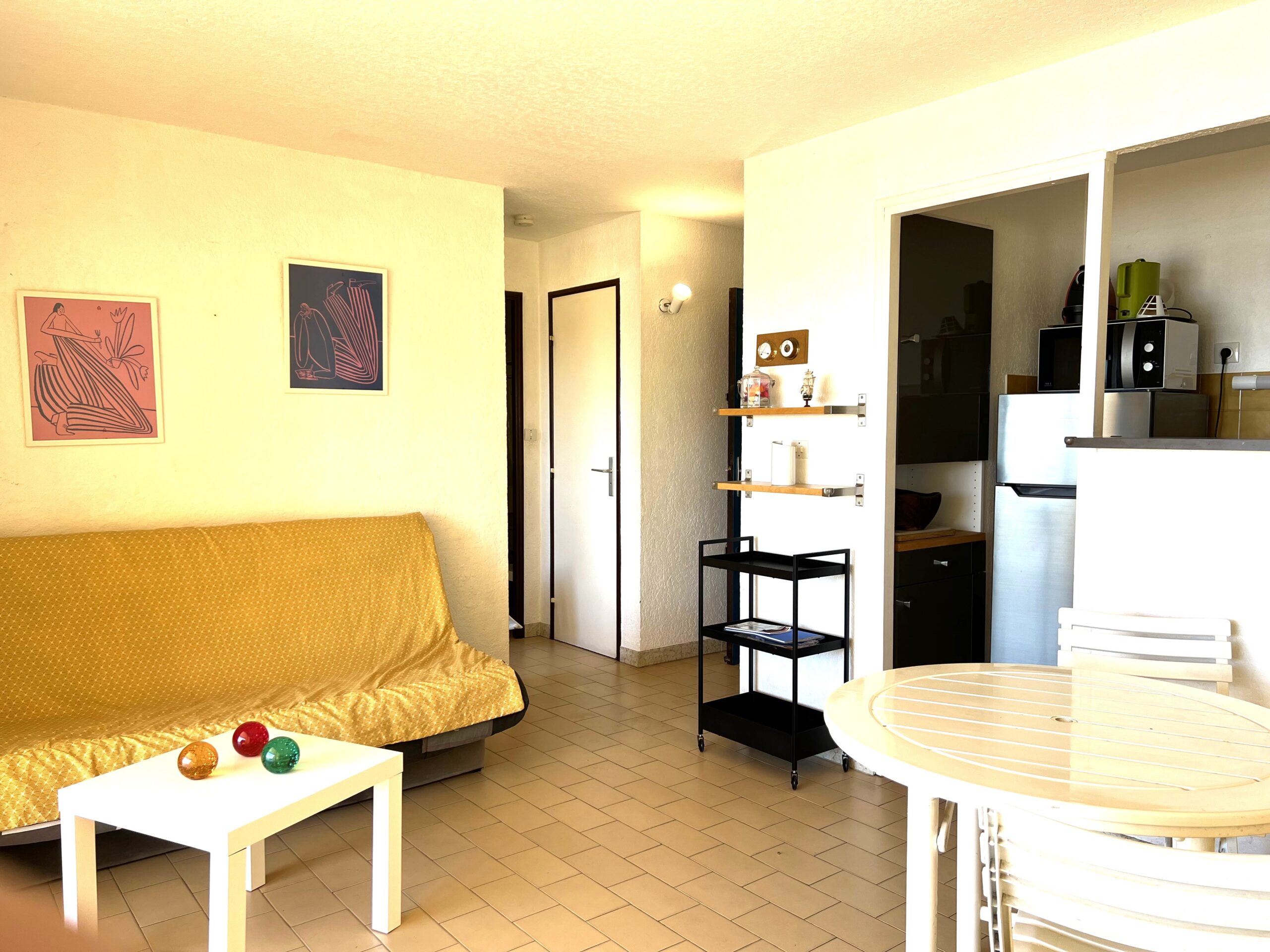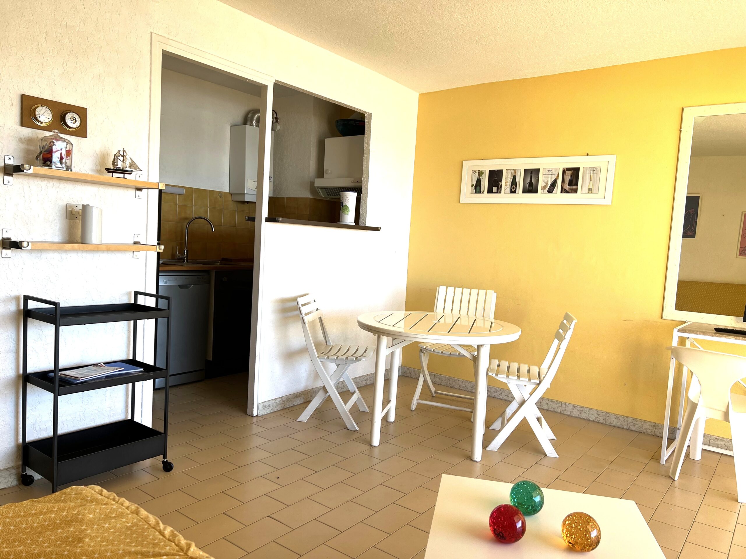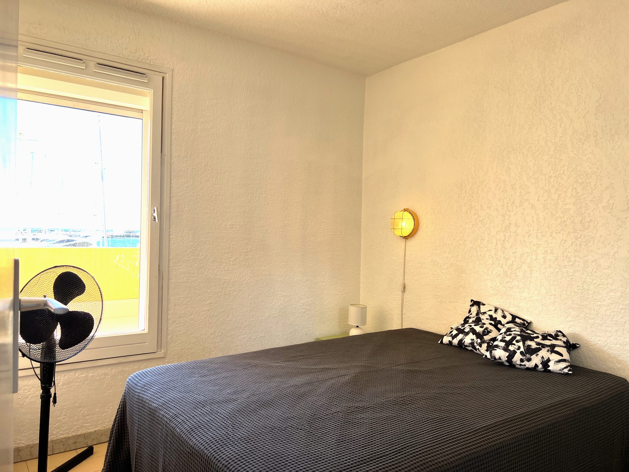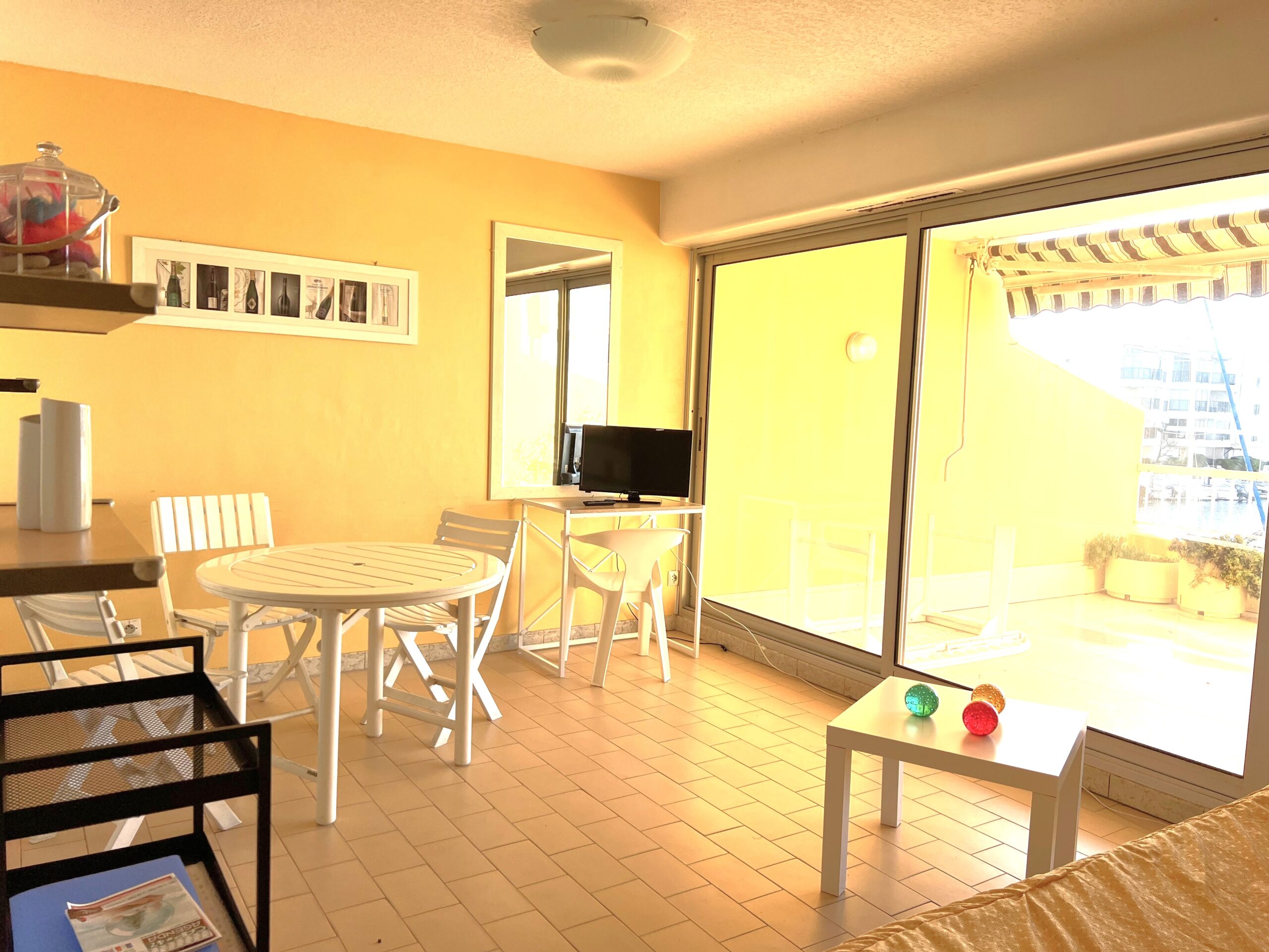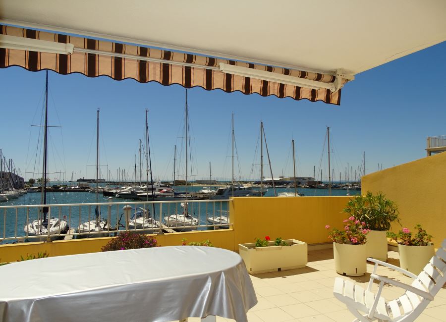 Agence immobilière Location Cap d’Agde – Appartement 2 pièces situé au 1er étage  avec ascenseur,  grande terrasse de 28 m² vue port et mer.